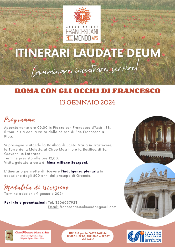 L’Associazione Francescani nel Mondo Aps, in collaborazione con l’Ordine Francescano Secolare del Lazio, l’Ufficio per la pastorale del Tempo libero, Turismo e Sport del Lazio e il CSI Roma sono lieti di condividere l’avvio dell iniziativa “Itinerari Laudate Deum”.