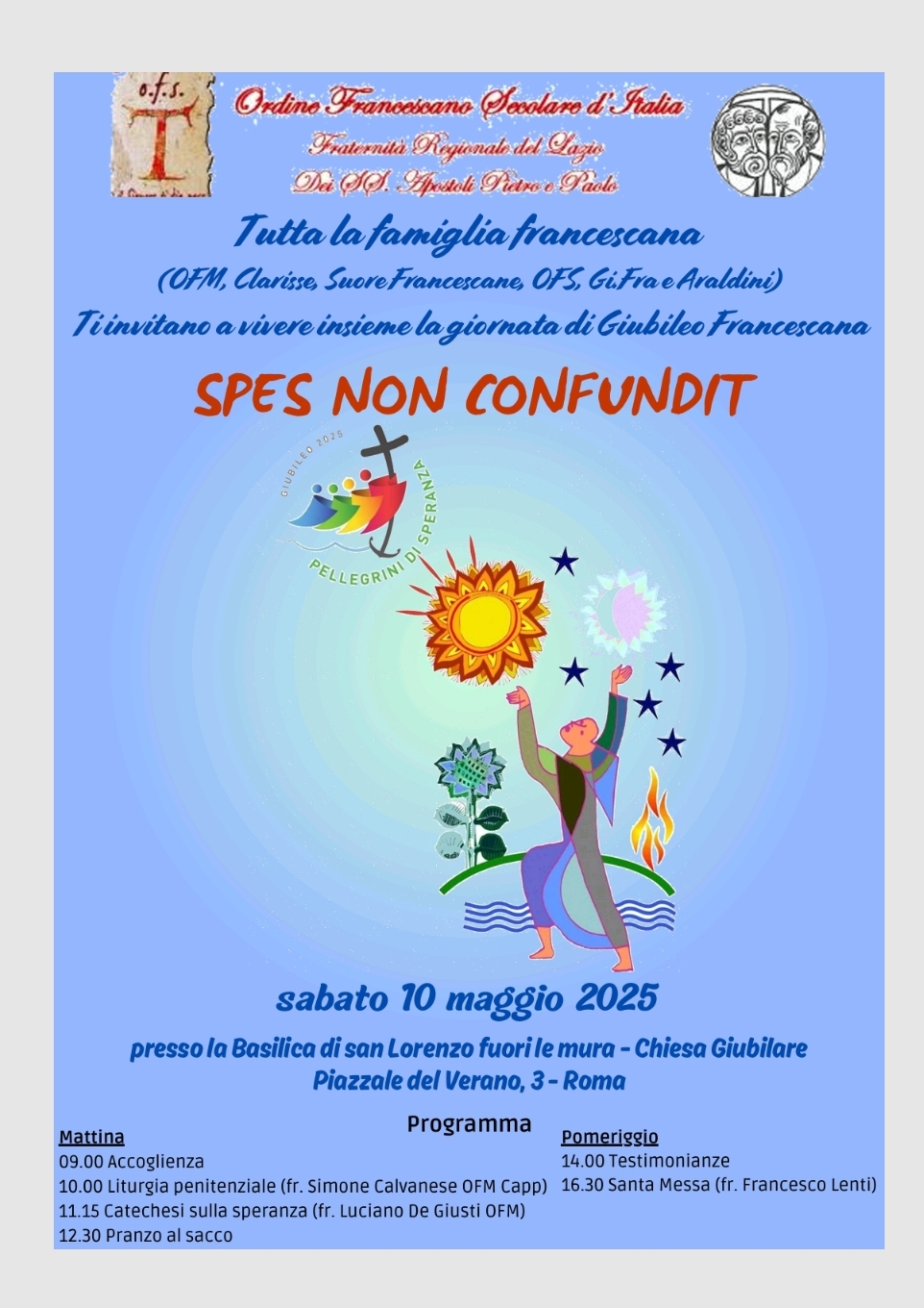 la speranza che è racchiusa nel cuore di ogni persona, come desiderio e attesa del bene, è la gioia concreta di ogni credente. Essa non confonde colui che l’ha riposta sulla Parola del Signore. Con questa gioia nel cuore confermiamo per il 10 maggio 2025 la giornata giubilare per tutta la famiglia Francescana del Lazio, presso la Basilica di san Lorenzo al Verano, già da tempo inserita nel nostro calendario regionale, con orario 09.00 – 18.00 e alla quale potrete invitare tutte le componenti Francescane del vostro territorio.